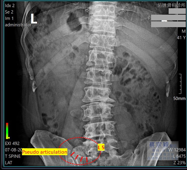 - 如上圖術前 X光顯示,病患第五腰椎左側橫突肥厚增生,與薦椎形成假性關節,以及雙側腰椎小面關節及骨盆的不穩定,同時導致脊椎側彎疼痛。