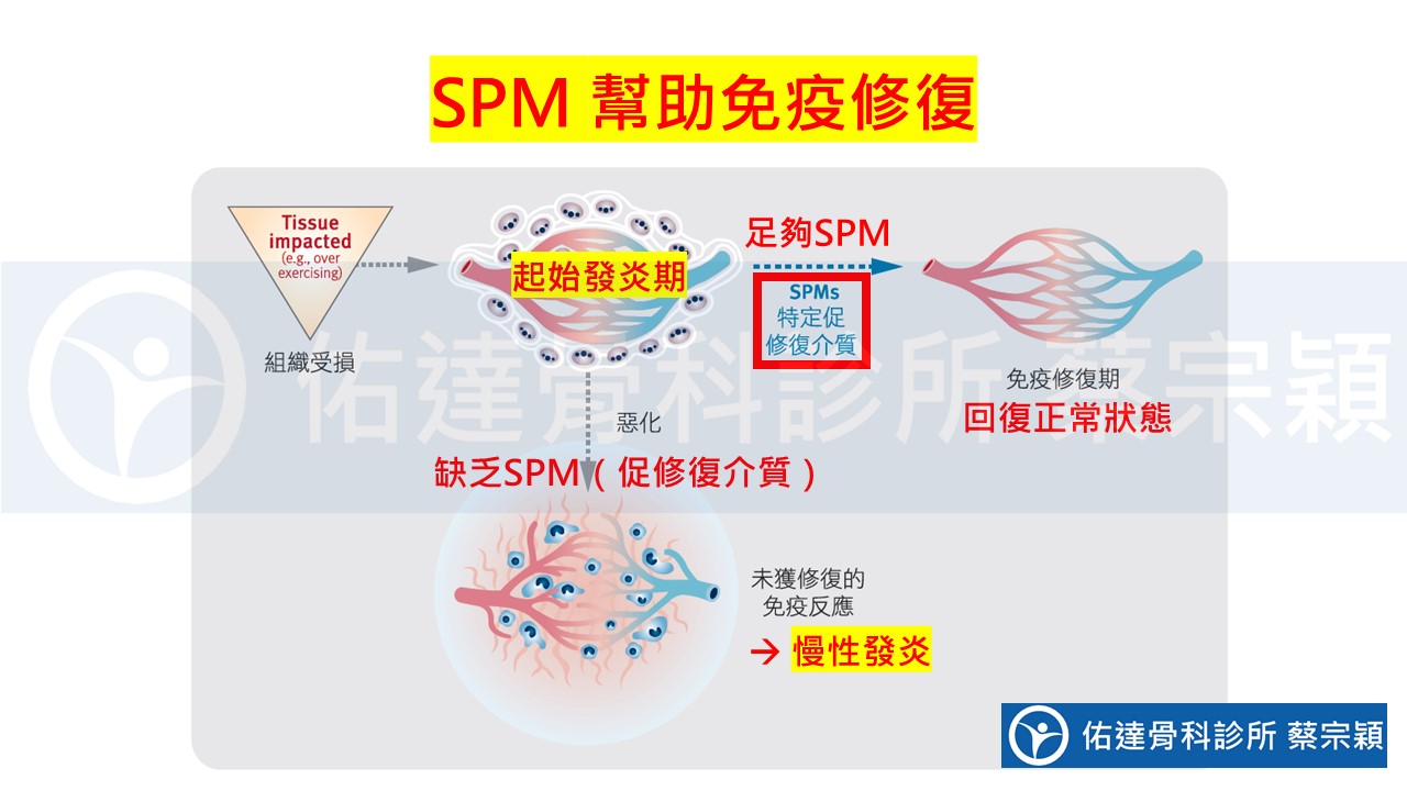 - 簡單來說,有足夠的SPM,可幫助損傷組織後段的修復期。